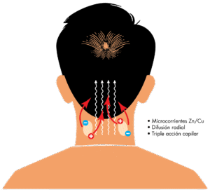 Los microfilamentos de cobre y zinc del parche generan una microcorriente (~300 µA, 0,4V) al contacto con la piel.